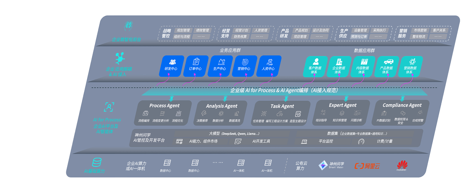 端到端的一站式AI工作空间深度融合了从企业战略规划到日常经营的全流程业务板块,,,定向解决车企内部领域多、、部门多、、、、链条长、、场景碎片化等难题,,,,支持车企快速构建以AI为核心的生产力写作体系,,实现任务执行与AI能力的无缝集成与交互