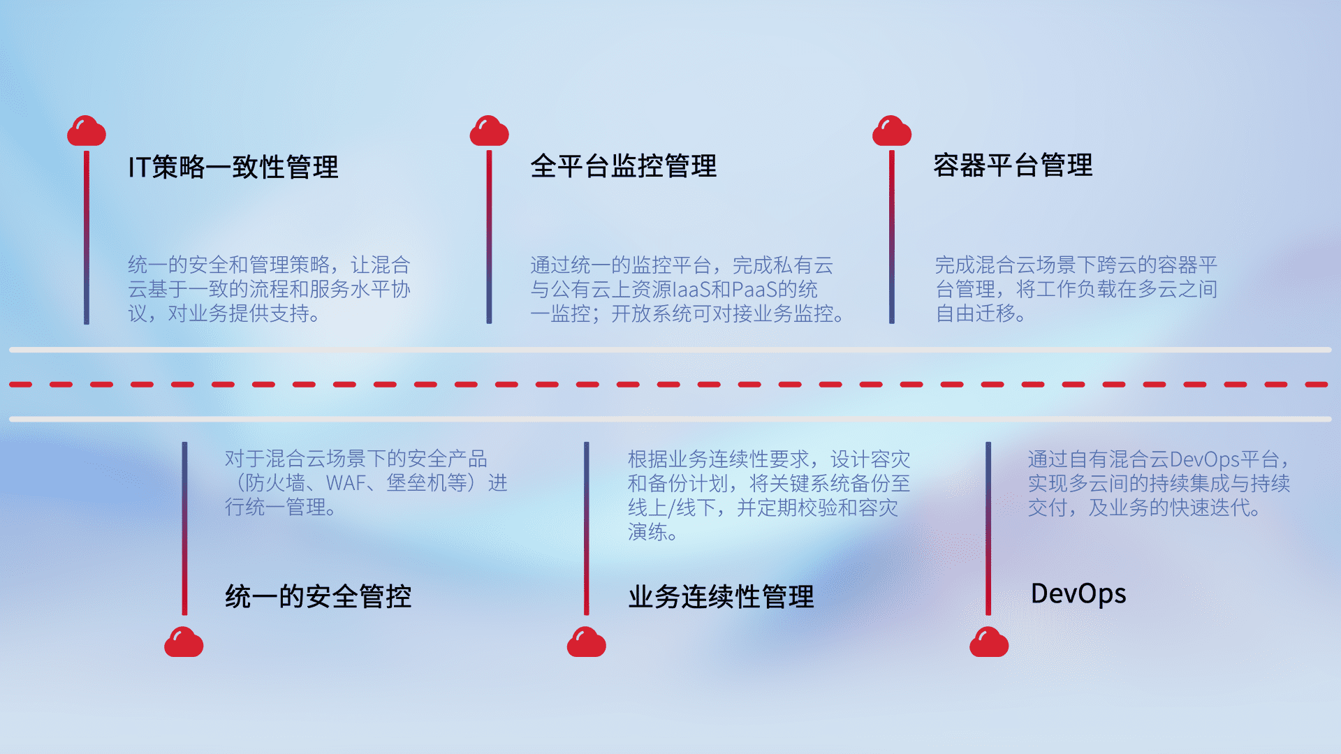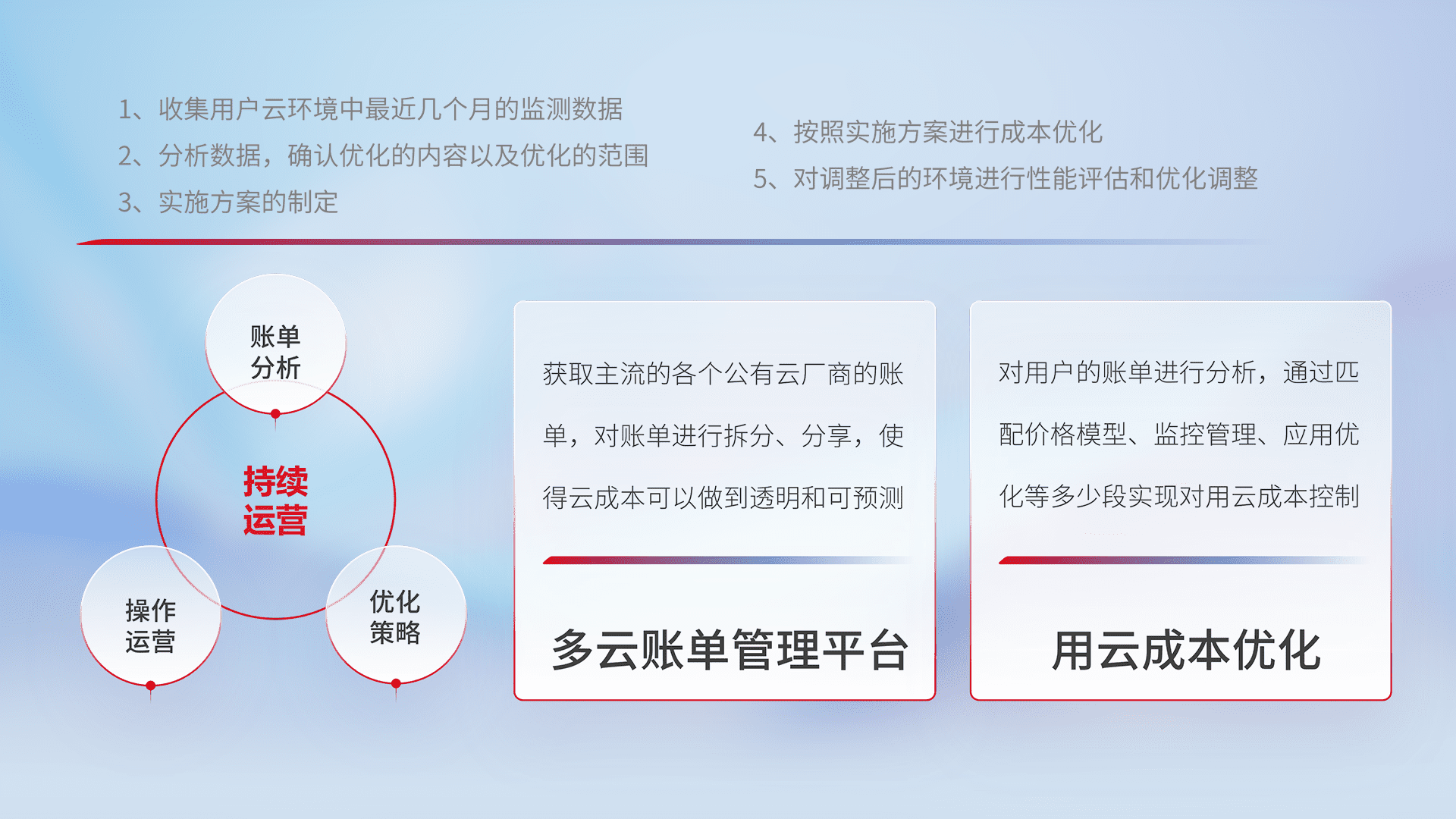 通过多云纳管,,,,以统一的资源数据模型把客户的云资源进行抽象和封装,,,,进而实现对多云资源的统一操作,,,,保障云资源管理的可靠性、、、、稳定性与可用性。。量身定制化运维内容,,配置、、、开发运维、、、补丁管理、、备份、、、、监控、、认证和访问管理、、、审计和日常巡检等,,保障在用云过程中的可靠度,,稳定度以及高可用率。。