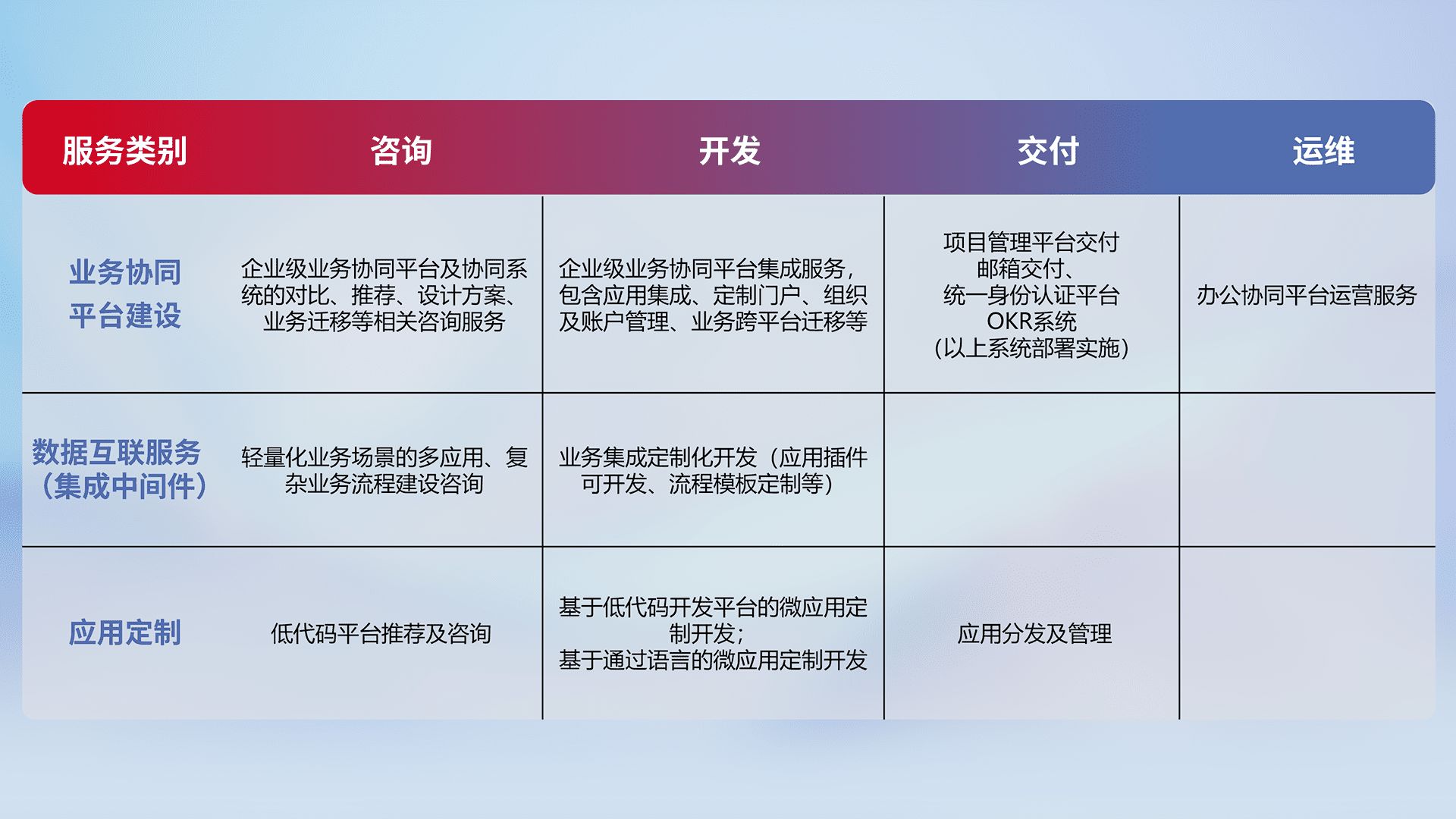针对钉钉、、、、企微、、、IDaas等平台级产品提供产品的规划、、、、方案、、、交付、、定制化开发等服务,,,,实现如统一协同办公、、、智能客户服务、、混合会议管理、、、智能数据查询、、等业务场景,,,,实现数字化转型。。